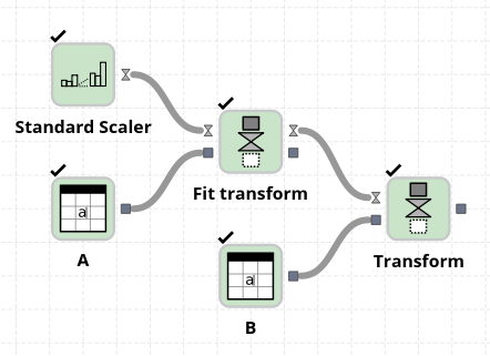 In a real application the model given by fitting or training A would typically be exported to disk using the “Export model” node, and imported back in another flow when using it for transforming or predicting on the B dataset.