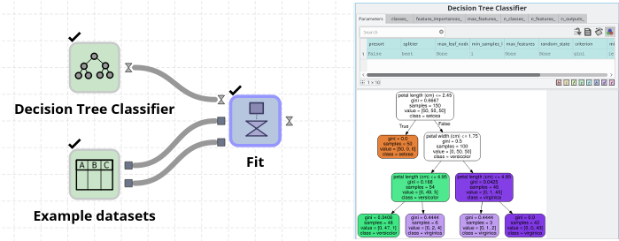 For example, if you start with a “Decision Tree Classifier” node and run it, then you get an unfitted model object. By connecting the model to a Fit node (uppermost port), and giving some example X (middle port) and Y (bottom port) data, then you can “train” the model from X. In the screenshot below the “Example dataset” node has been configured to use the “Iris” dataset. On the right side we can see the output model created by the Fit node. This displays the learned decision tree. This visualization requires that Graphviz/dot is installed and configured.