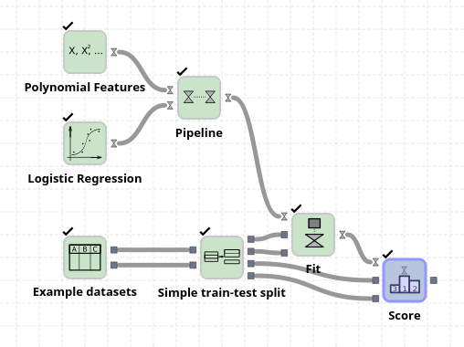 In the example above a “Polynomial features” node is used to create all polynomials of degree two from the features in the Iris dataset. These new features include, for example, petal width * petal height, petal width^2, etc. By pipelining this polynomial feature node to the logistic regression node we can improve the final output score from circa 95% to 100%.
