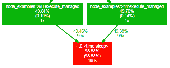 The function call graph contains a node for each function that has been called in the profiled code. The color of the node gives you a hint about how much of the total time was spent inside a specific function. Blue nodes represent functions with low total running time and red nodes represent functions with high total running time. The nodes have the following layout: